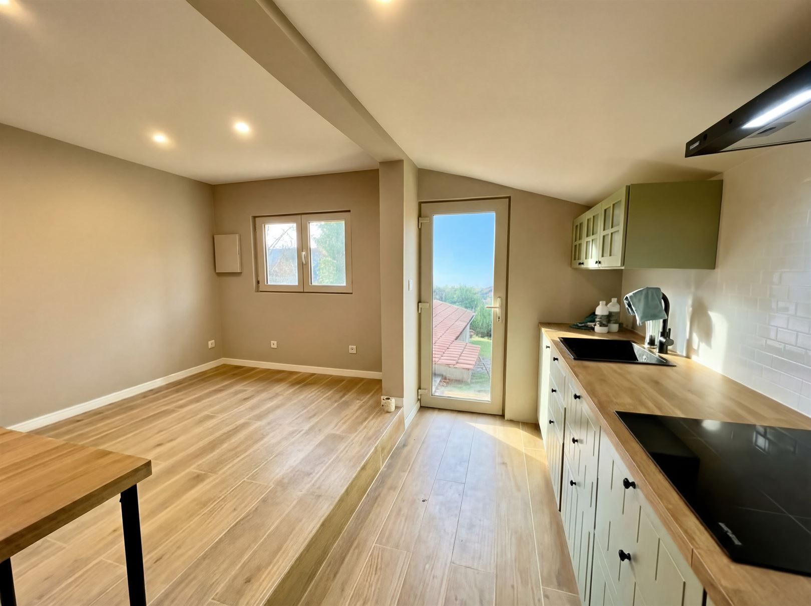 Het huis bestaat uit een keuken (keramische kookplaat, afzuigkap, koelkast, gootsteen, kasten), woonkamer, slaaphoek en een doucheruimte (wastafel, toilet en douche). Een een bijlage aan de voorzijde van +- 13 m² met plaats voor een wasmachine.