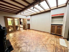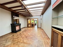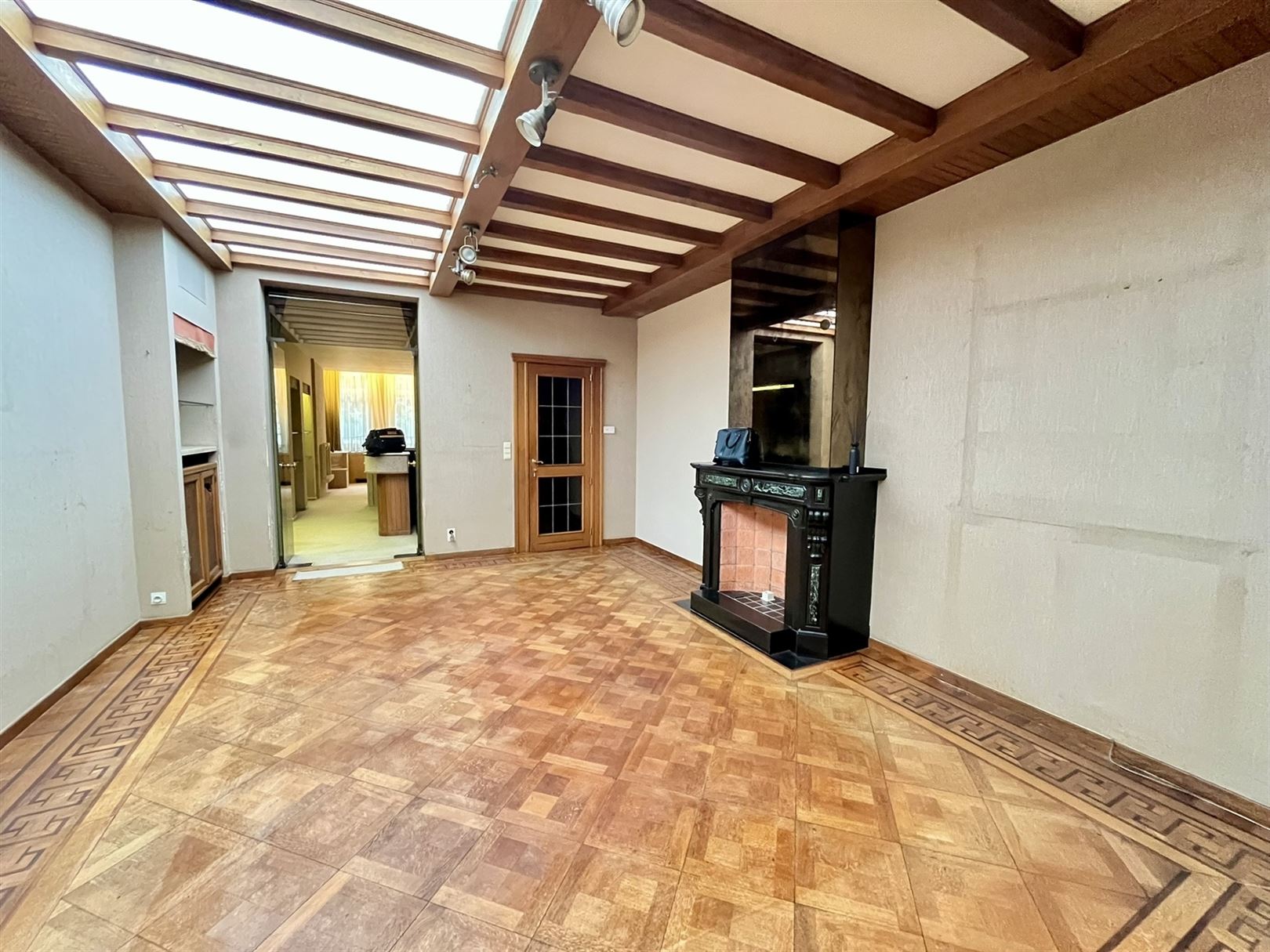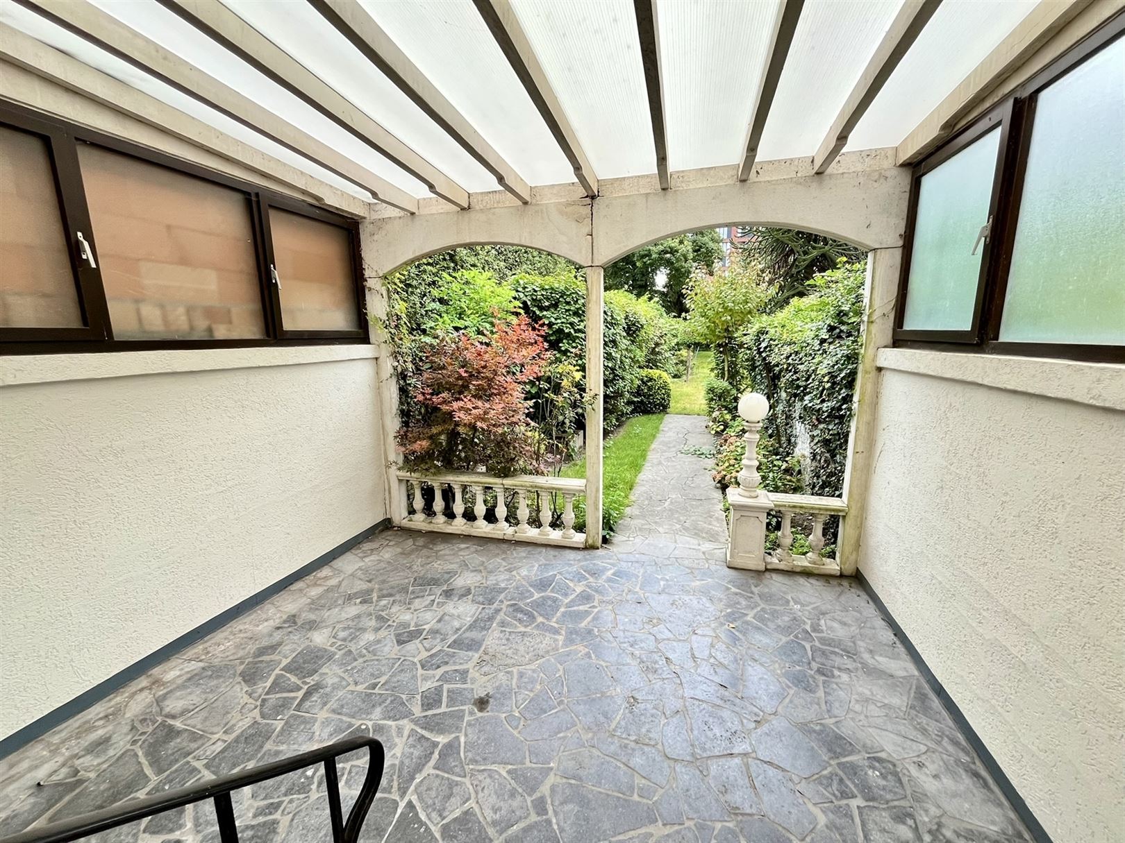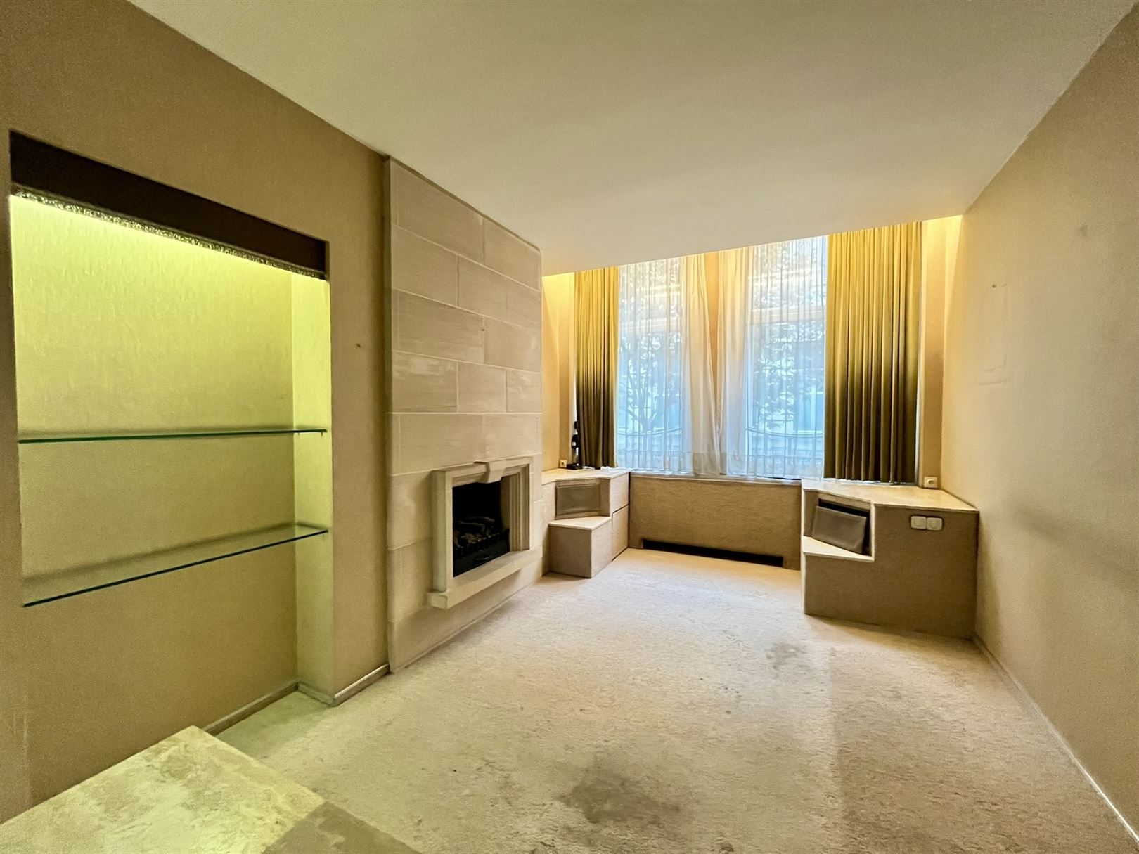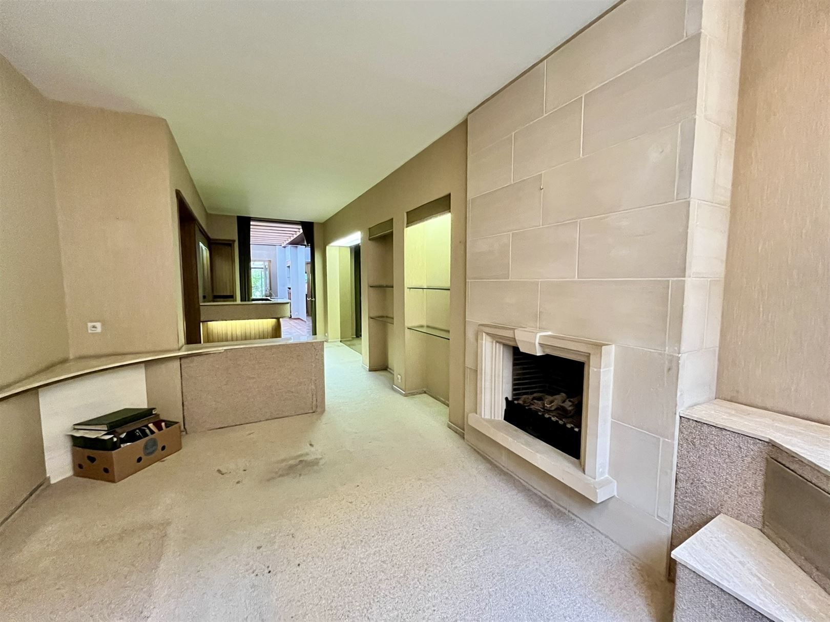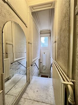 Het huis bestaat op de begane grond uit een inkomhal, een woonkamer van +- 25 m², een eetkamer van +- 27 m², een keuken van +- 17 m², een apart toilet en een overdekt terras dat toegang geeft tot de ruime tuin. Entresol 1: een badkamer en een apart toilet.